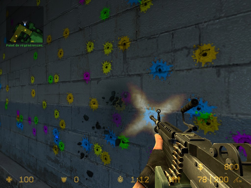 Мод превращает пули в краску на выбор несколько цветов, для выбора цвета пуль в чате надо написать !paintball